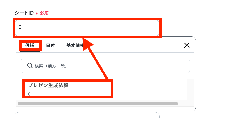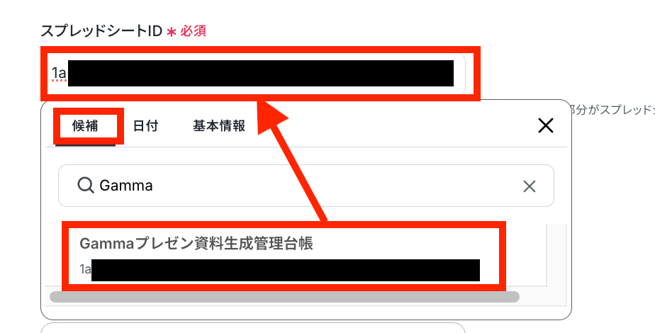 次に「スプレッドシートID」を設定します。 入力欄をクリックすると、候補一覧が表示されるので連携したいシートを選んでください。