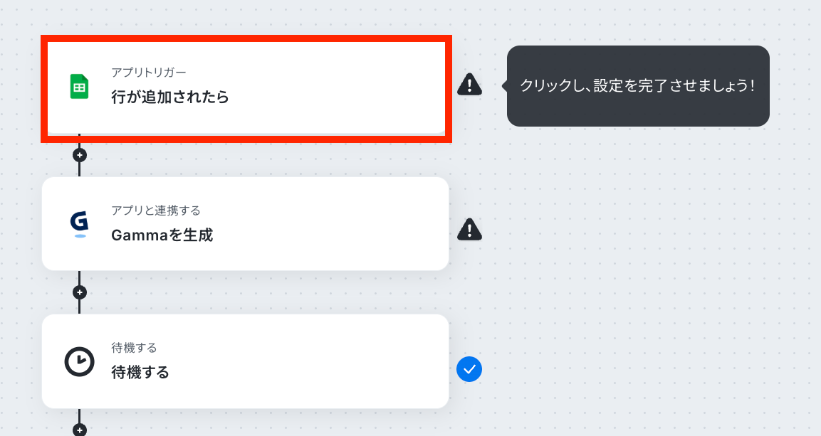 はじめに、Gamma、Google スプレッドシート、Google DriveをYoomと連携します。 次に、トリガーでGoogle スプレッドシートを選択し、「行が追加されたら」というアクションを設定します。 続けて、オペレーションでGammaの「Gammaを生成」アクションを設定します。 次に、生成完了まで待機するため、待機機能の「待機する」アクションを設定します。 その後、Gammaの「生成したファイルURLを取得」アクションと「生成したファイルを取得」アクションを順に設定します。 最後に、オペレーションでGoogle Driveの「ファイルをアップロードする」アクションを設定し、生成されたファイルを格納します。 ※「トリガー」:フロー起動のきっかけとなるアクション、「オペレーション」:トリガー起動後、フロー内で処理を行うアクション■このワークフローのカスタムポイント