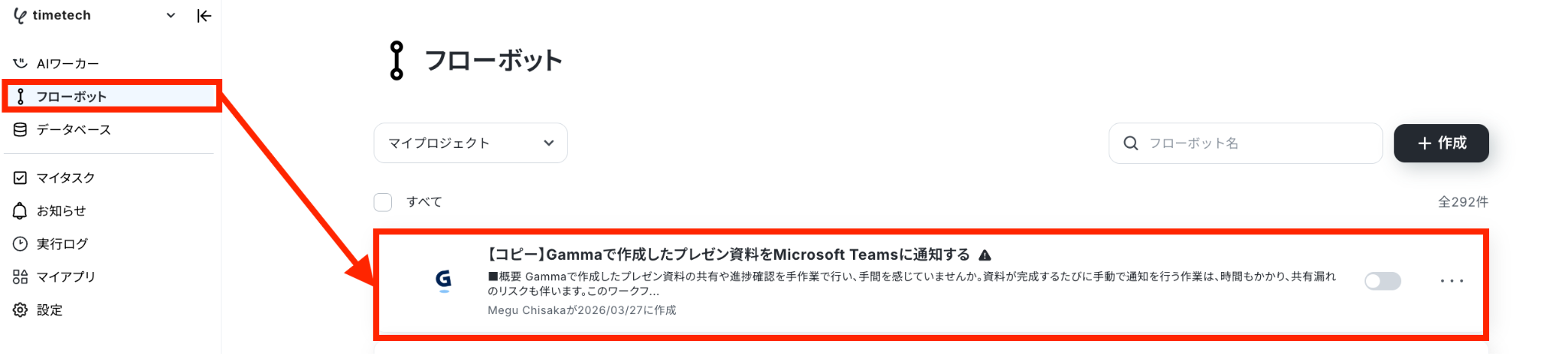 左側にあるメニューの「フローボット」から、コピーしたテンプレートを開きます。 (※テンプレートをコピー後、すぐに設定する場合はテンプレートを開く操作は不要です。設定を中断した場合のみ「フローボット」から設定作業を再開してください!)