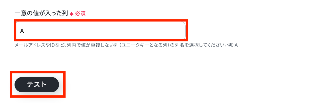 「一意の値が入った列」を注釈を参考に設定します。 全ての項目の設定が完了したら「テスト」をクリックしてください。