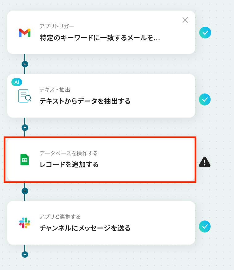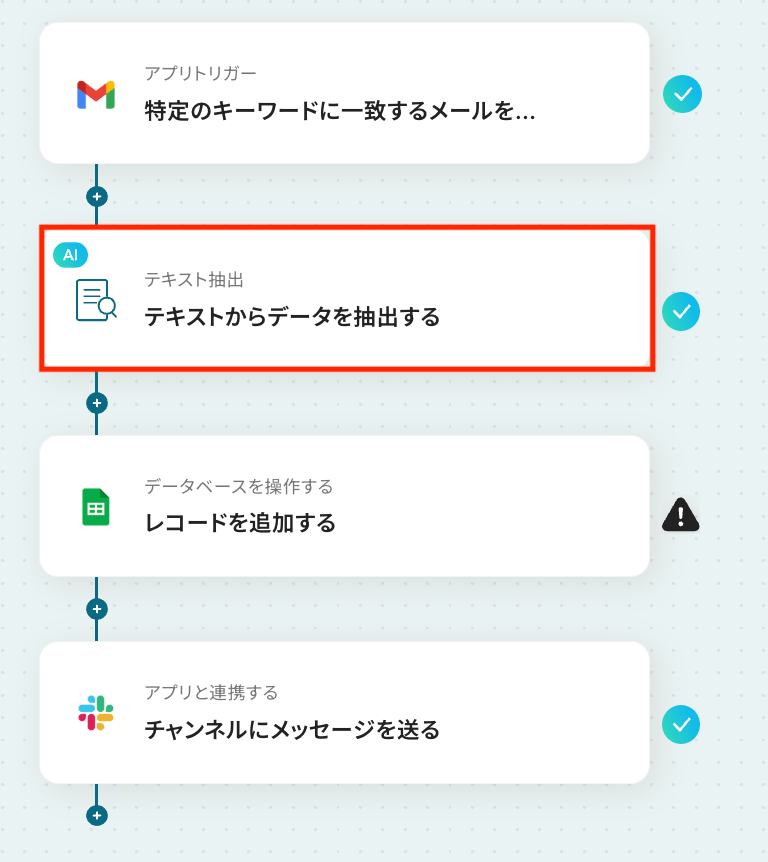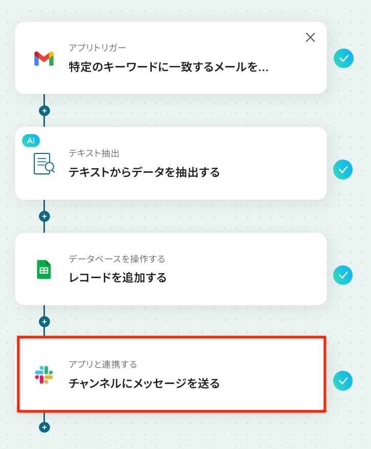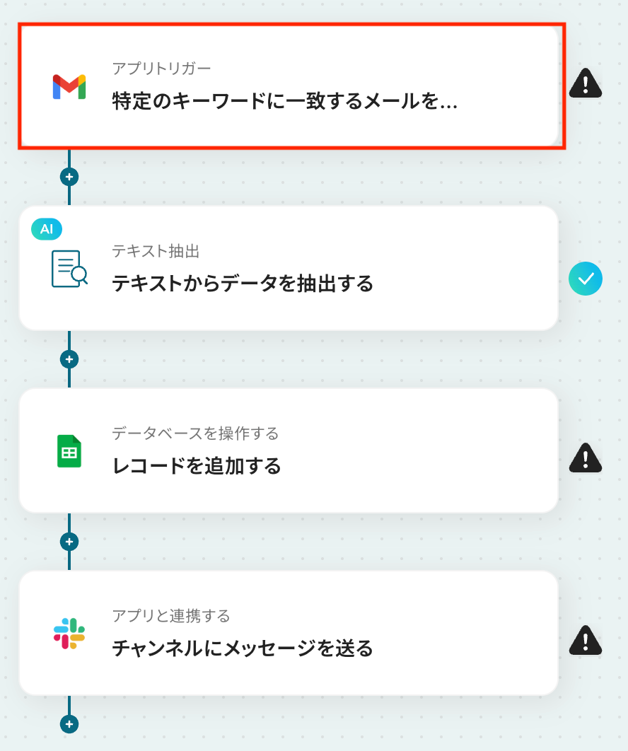 Gmailのトリガー設定では、検知対象としたいメールに含まれるキーワードを任意で設定できます。 AI機能によるテキスト抽出では、抽出したい項目(例:会社名、担当者名、問い合わせ内容など)を自由にカスタマイズすることが可能です。 Google スプレッドシートへの追加アクションでは、データを出力したいスプレッドシートやシート、書き込みたいテーブル範囲などを任意で指定できます。 Slackへの通知アクションでは、通知先のチャンネルを自由に設定できるほか、本文に前段のオペレーションで取得した情報を変数として埋め込むことも可能です。 ■注意事項