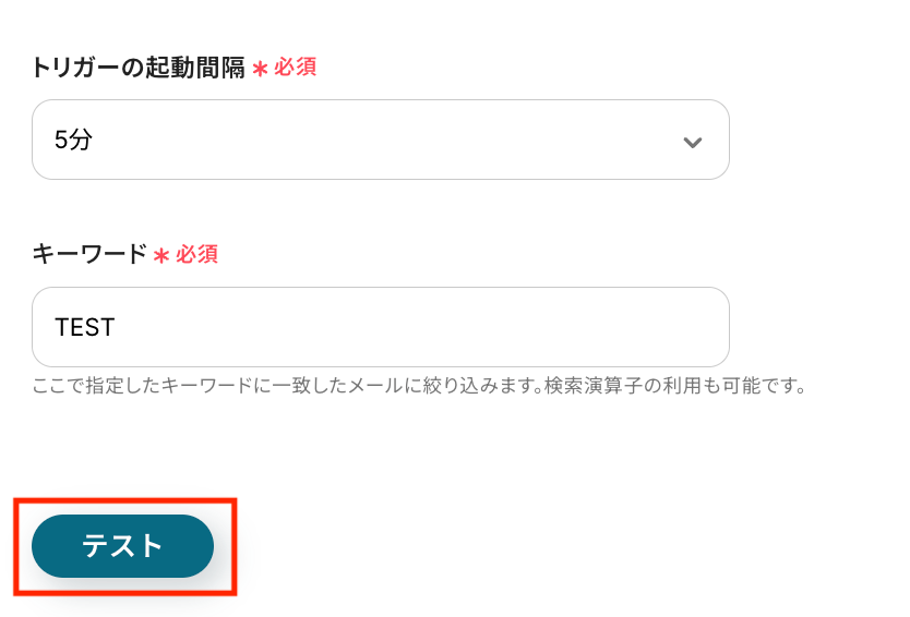 トリガーの起動間隔を選択し、検索したいキーワード(ここでは「TEST」)を入力します。
