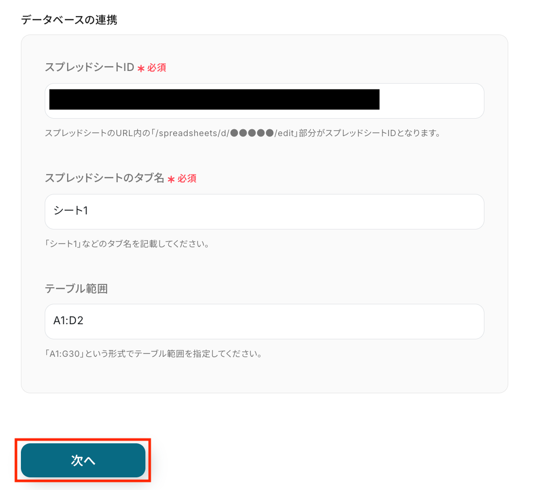 Yoom側でスプレッドシートIDとシート名、テーブル範囲(例:A1:D2)を入力します。 入力ができたら「次へ」をクリックしましょう。