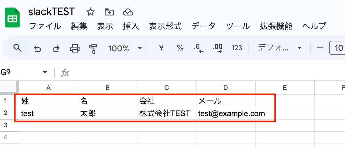 スプレッドシートを開き、姓・名・会社・メールの各列に値が正しく書き込まれていることを確認します。