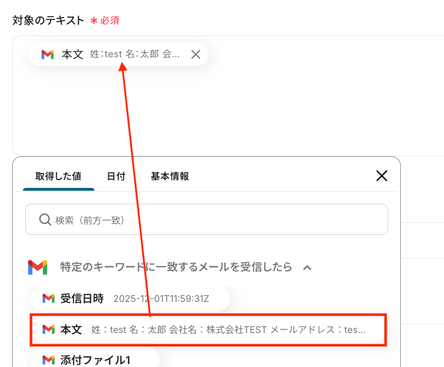 抽出対象のテキストとして、Gmailトリガーで取得した「本文」を選択しましょう。