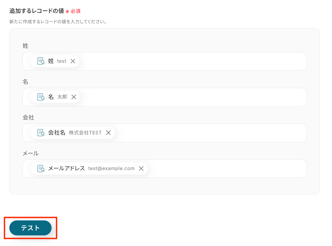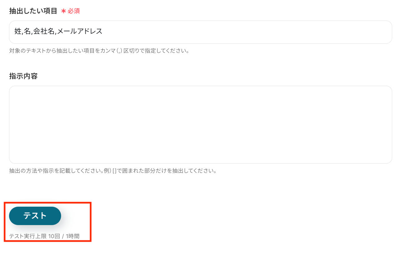 抽出したい項目をカンマ区切りで入力してください。 今回は「姓,名,会社名,メールアドレス」を入力しました。 入力ができたら「テスト」をクリックしてください。