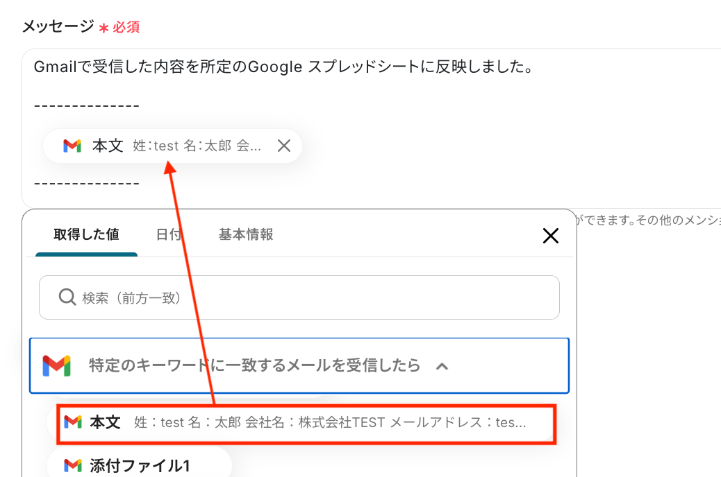 ※以下のように取得した値を設定することで、トリガーが実行されるたびに最新のメール本文が反映されます。