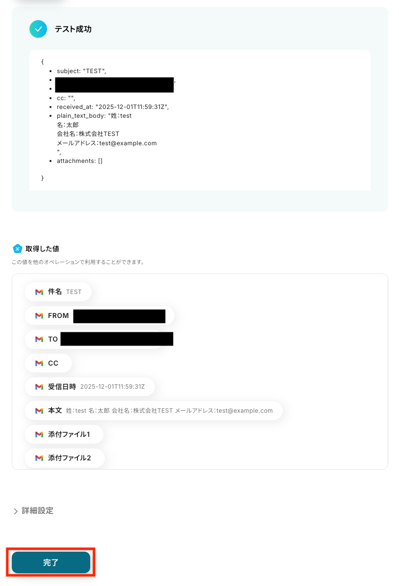 テスト結果として、件名や本文などの情報が表示されます。 内容に問題がなければ「完了」をクリックしてください。 ここで取得した値を次以降のステップで活用します。 ※取得した値 とは? トリガーやオペレーション設定時に「テスト」を実行して取得した値のことです。 後続のオペレーション設定時の値として利用でき、フローボットを起動する度に変動した値となります。