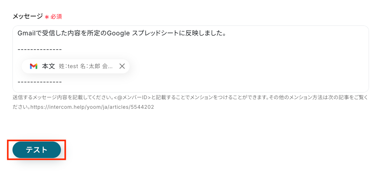 テスト結果として、Slackに送信されたメッセージ内容が表示されます。