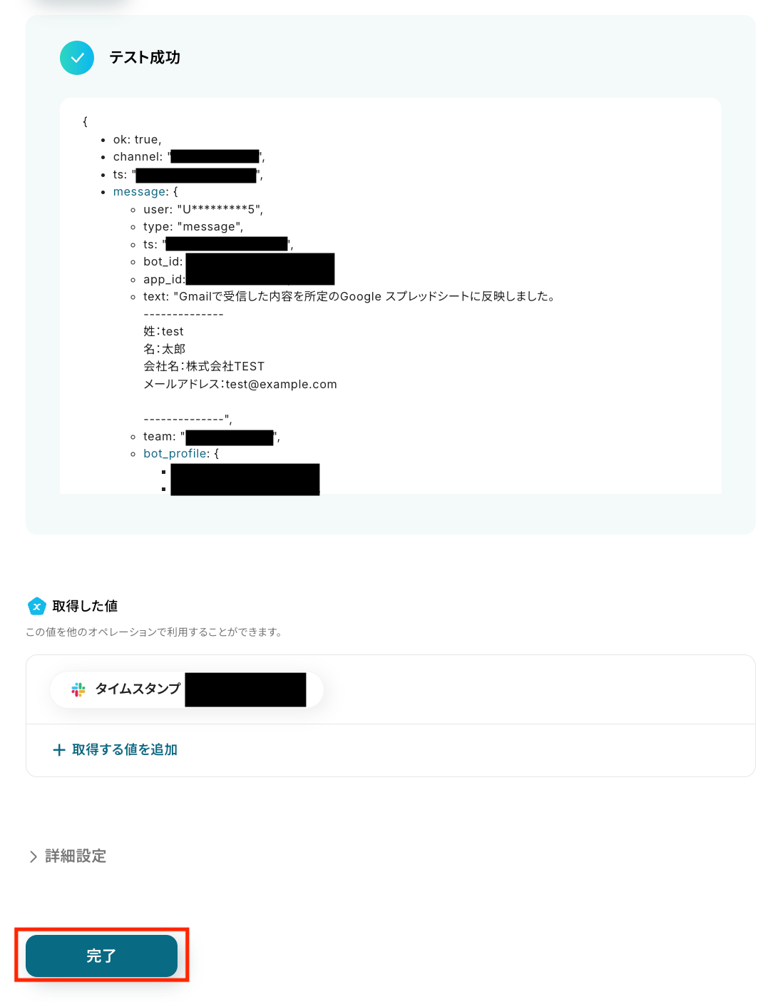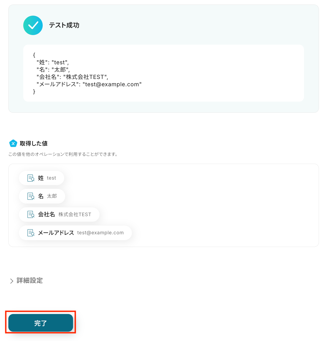 テスト結果として、指定した項目ごとに値が抽出されていることを確認します。 問題がなければ「完了」をクリックしましょう。
