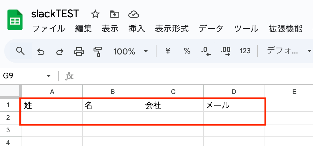 スプレッドシート側では、1行目に「姓・名・会社・メール」の見出しを用意しておきます。