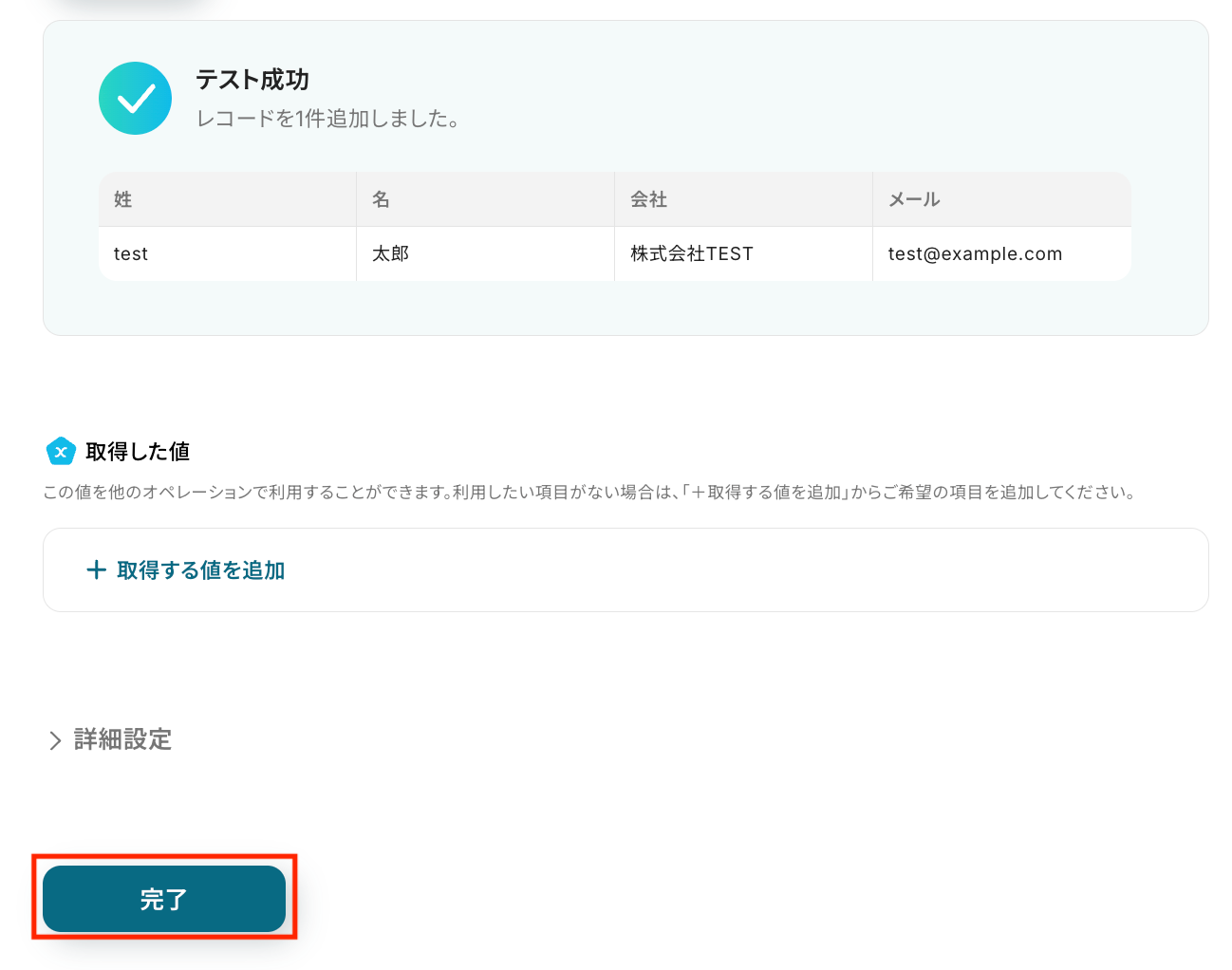 テスト成功と表示され、プレビューの表に1件分のレコードが追加されたことを確認します。 問題がなければ「完了」をクリックしましょう。