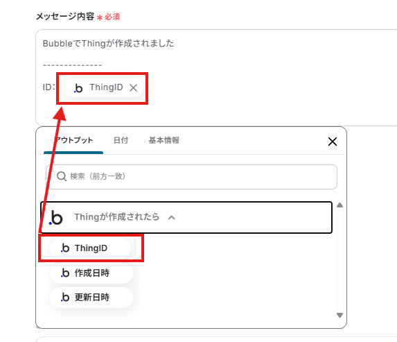 「メッセージ内容」は、入力欄をクリックして表示されるアウトプットから選択できます。