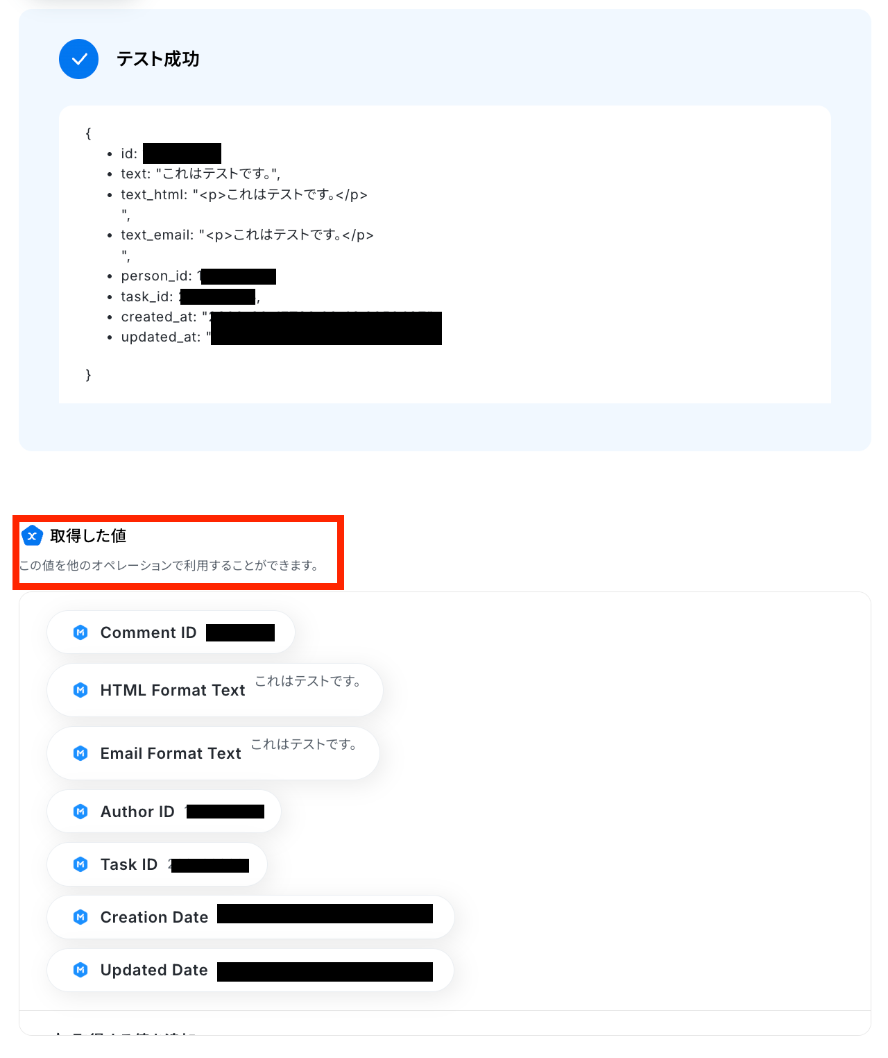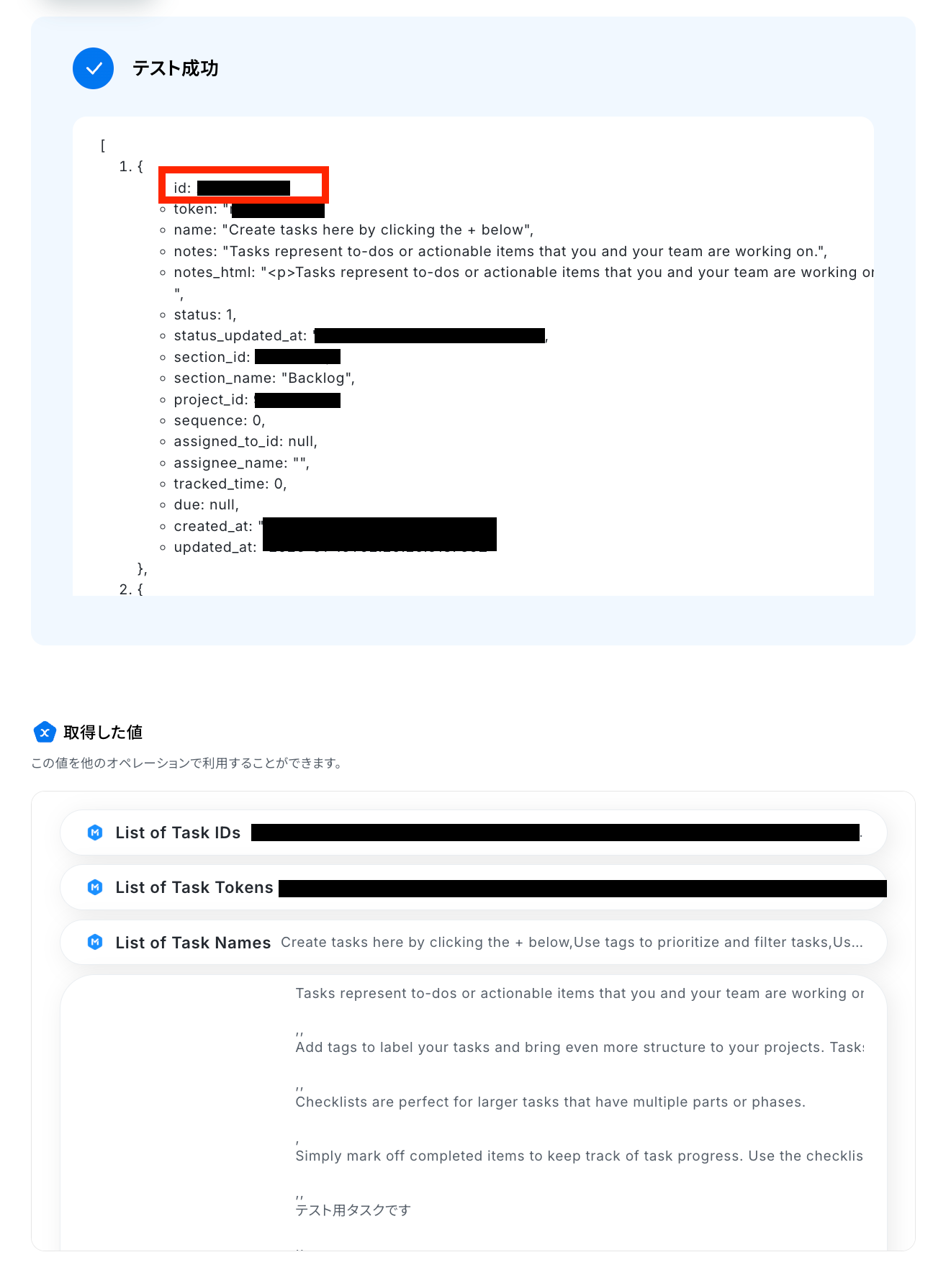 テスト成功でTask IDが取得されています。作成したタスクの「タスクID」と「token」が一致している「id」をコピーしておきましょう!