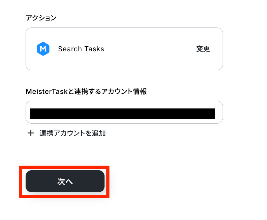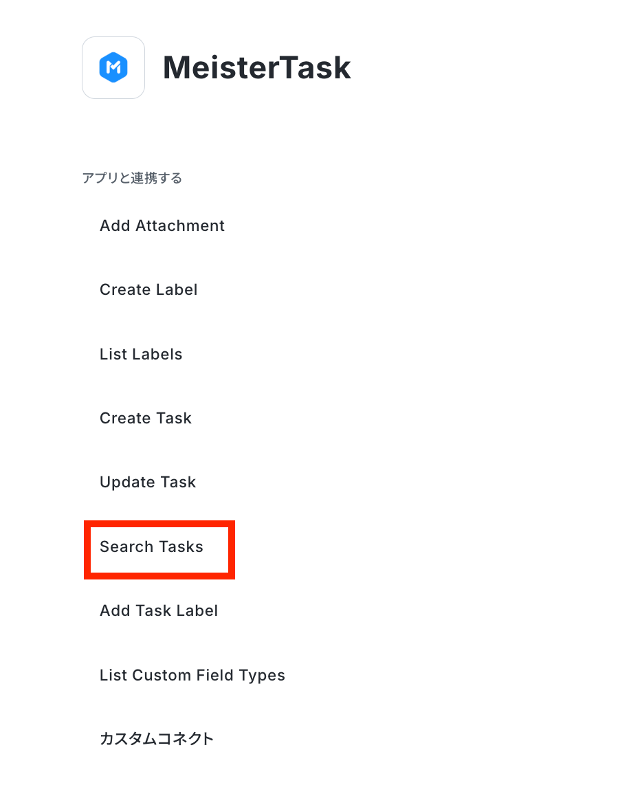 Task IDを取得するため、一時的にオペレーションを追加します。赤枠のプラスマークからMeisterTaskを選択して、アクションは「Search Tasks」を選択しましょう!