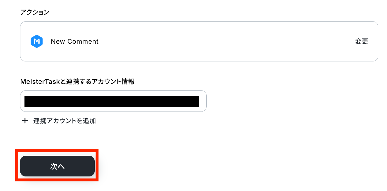 - 次に、トリガーでMeisterTaskを選択し、「新しいコメントが追加されたら」というアクションを設定します。