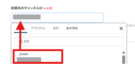 「投稿先のチャンネル」は、以下の画面のように入力欄の下に表示される候補からクリックしましょう。