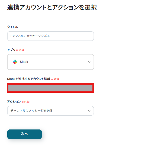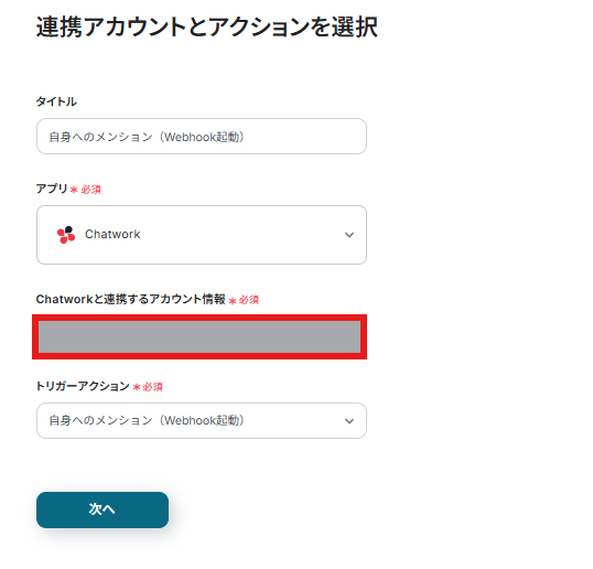 続いて連携アカウントとアクションを選択する画面が表示されるので、今回連携するChatworkのアカウントで間違いないかを確認し「次へ」をクリックします。
