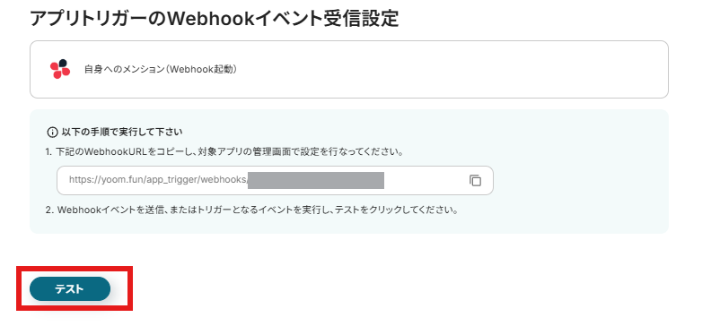 このステップではChatworkでメンションされたことをYoomのAPIで検知し、この自動化のトリガーにするための設定を行います。
