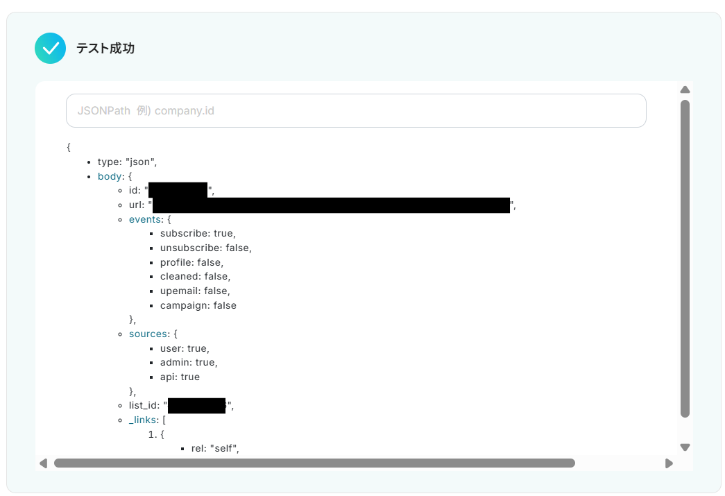 テストが成功すると、クラウドサインから取得した情報をアウトプットとして引用できるようになります。