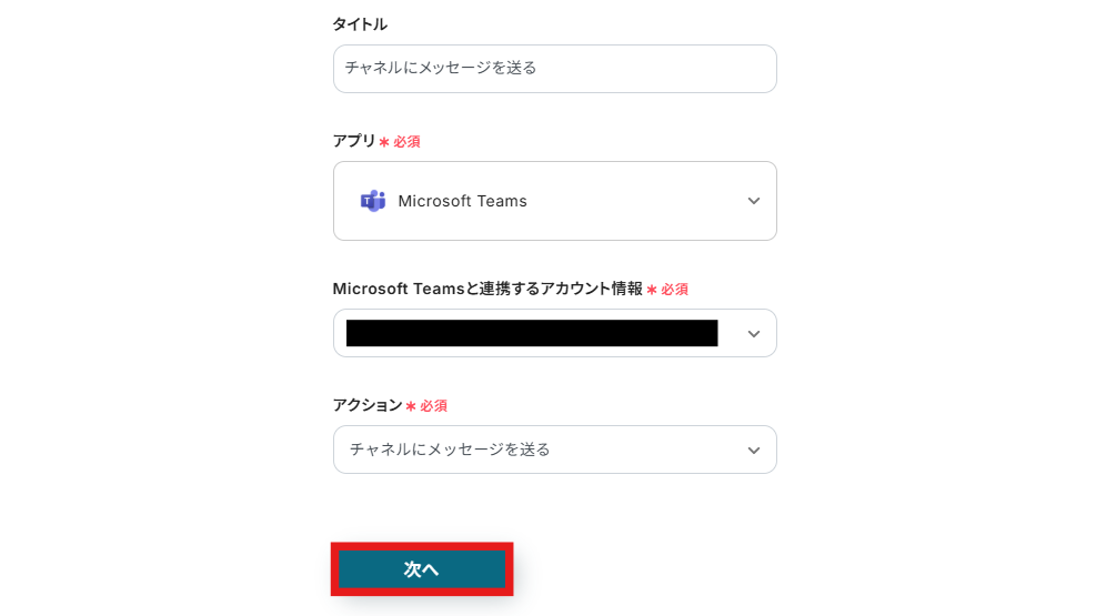 アクションは「チャネルにメッセージを送る」を選択して「次へ」をクリックしましょう。