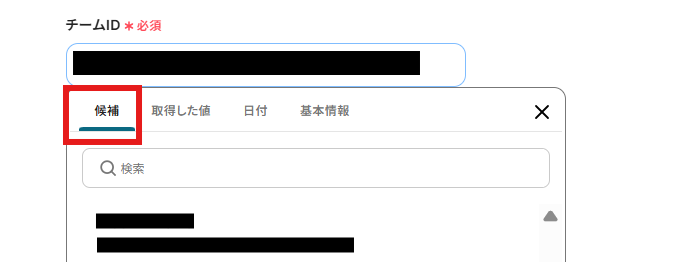 チームID、チャネルID:クリックすると下図のように、連携しているアカウントから候補が表示されます。