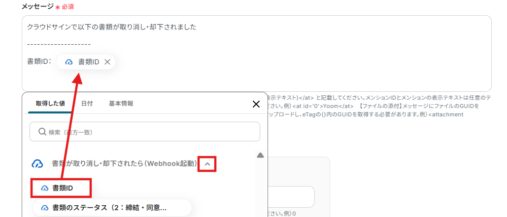 「書類ID」や「書類のステータス」など、クラウドサインの情報を引用したい部分は、アウトプットを用いて入力しましょう!