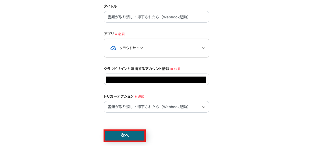 トリガーは「書類が取り消し・却下されたら(Webhook起動)」を選択して「次へ」をクリックしましょう。