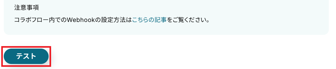 設定が完了したらテストしてください。※「テスト」をクリックすると設定したチャンネルへ実際に投稿されます。 テストの際はテスト用のチャンネルに投稿したり、事前にメンバーに通知しておくなどがおすすめです。