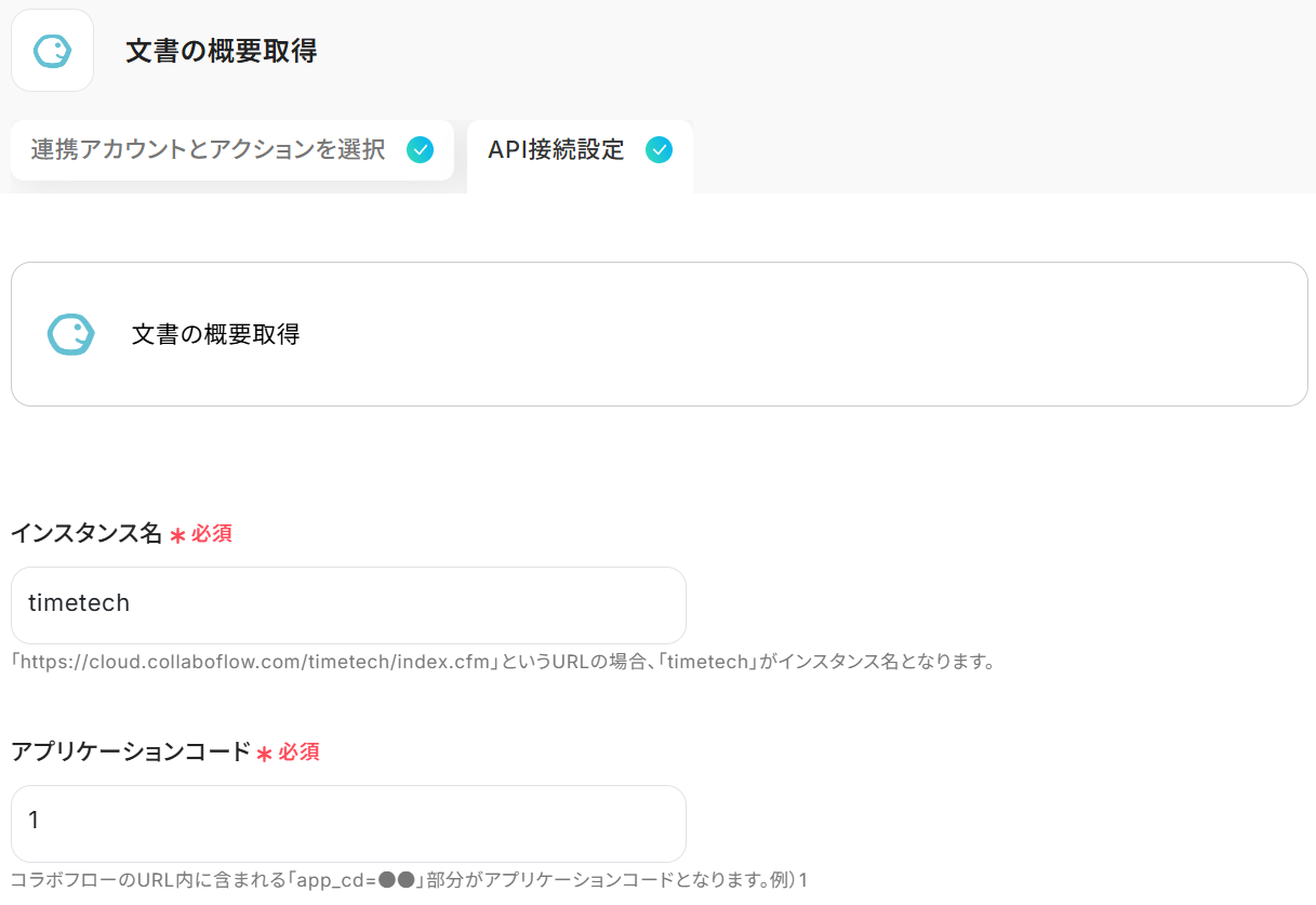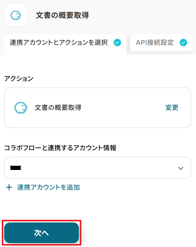 ステップ3と同様、アクションは「文書の概要取得」のまま「次へ」をクリックします。