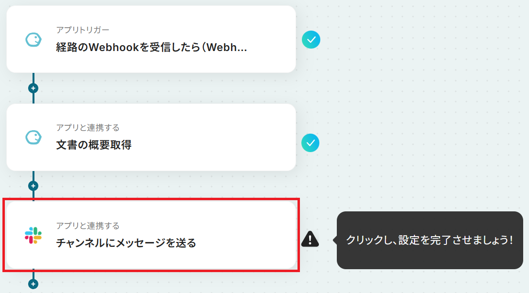 先ほど取得した文書概要をSlackで通知するので、「チャンネルにメッセージを送る」をクリック。