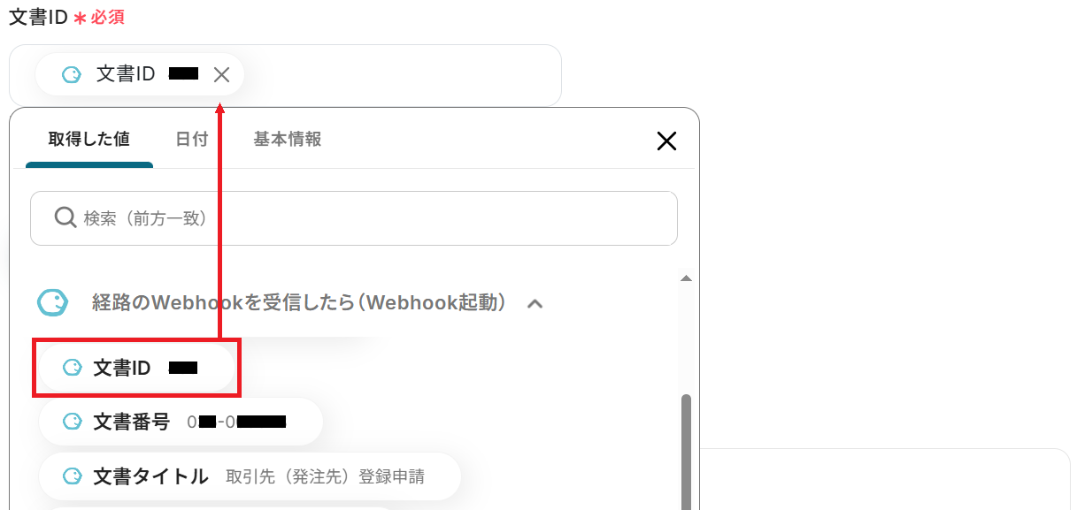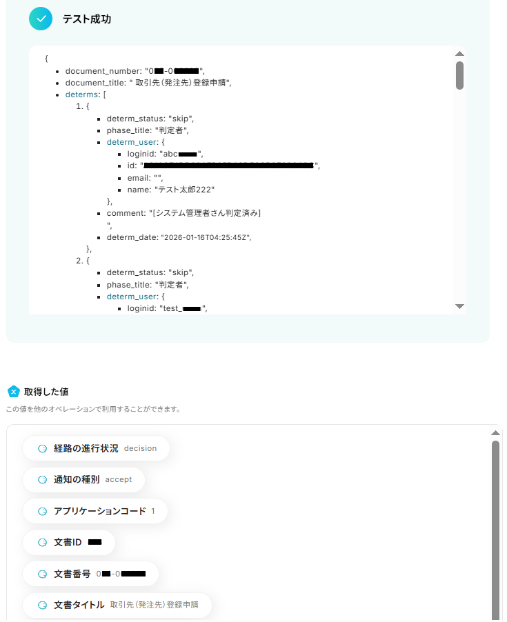 文書ID の欄には、トリガーで取得した「文書ID」の値が予め設定されているので、そのままテストしてください。 ※以下のように取得した値を設定することで、トリガーが実行されるたびに最新の文書情報が反映されます。