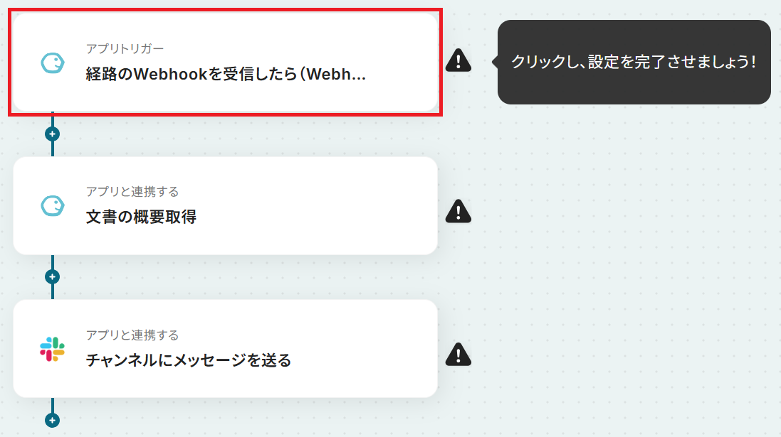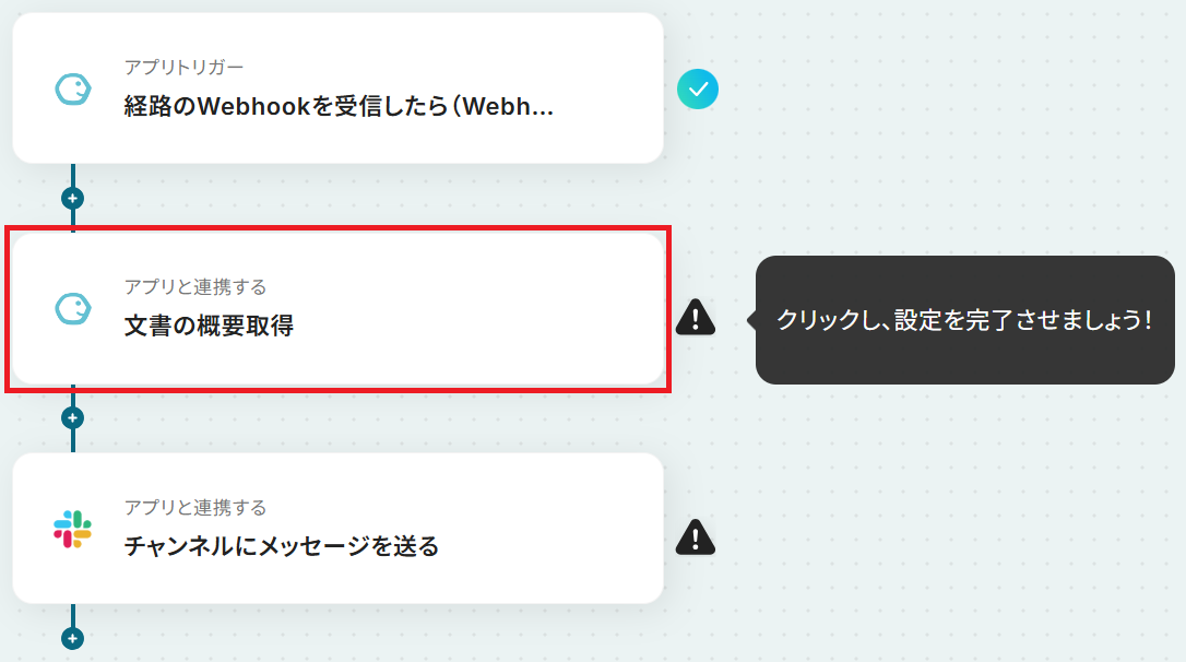 はじめに、コラボフローとSlackをYoomと連携します 次に、トリガーでコラボフローを選択し、「経路のWebhookを受信したら」アクションを設定します 次に、オペレーションでコラボフローの「文書の概要取得」アクションを設定します 最後に、オペレーションでSlackの「チャンネルにメッセージを送る」アクションを設定し、取得した文書の概要を特定のチャンネルに通知します ※「トリガー」:フロー起動のきっかけとなるアクション、「オペレーション」:トリガー起動後、フロー内で処理を行うアクション■このワークフローのカスタムポイント