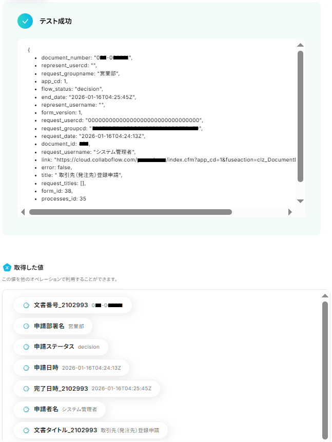 成功したら保存してください。 ここで取得した値を次以降のステップで活用します。 ※取得した値 とは? トリガーやオペレーション設定時に「テスト」を実行して取得した値のことです。 後続のオペレーション設定時の値として利用でき、フローボットを起動する度に変動した値となります。