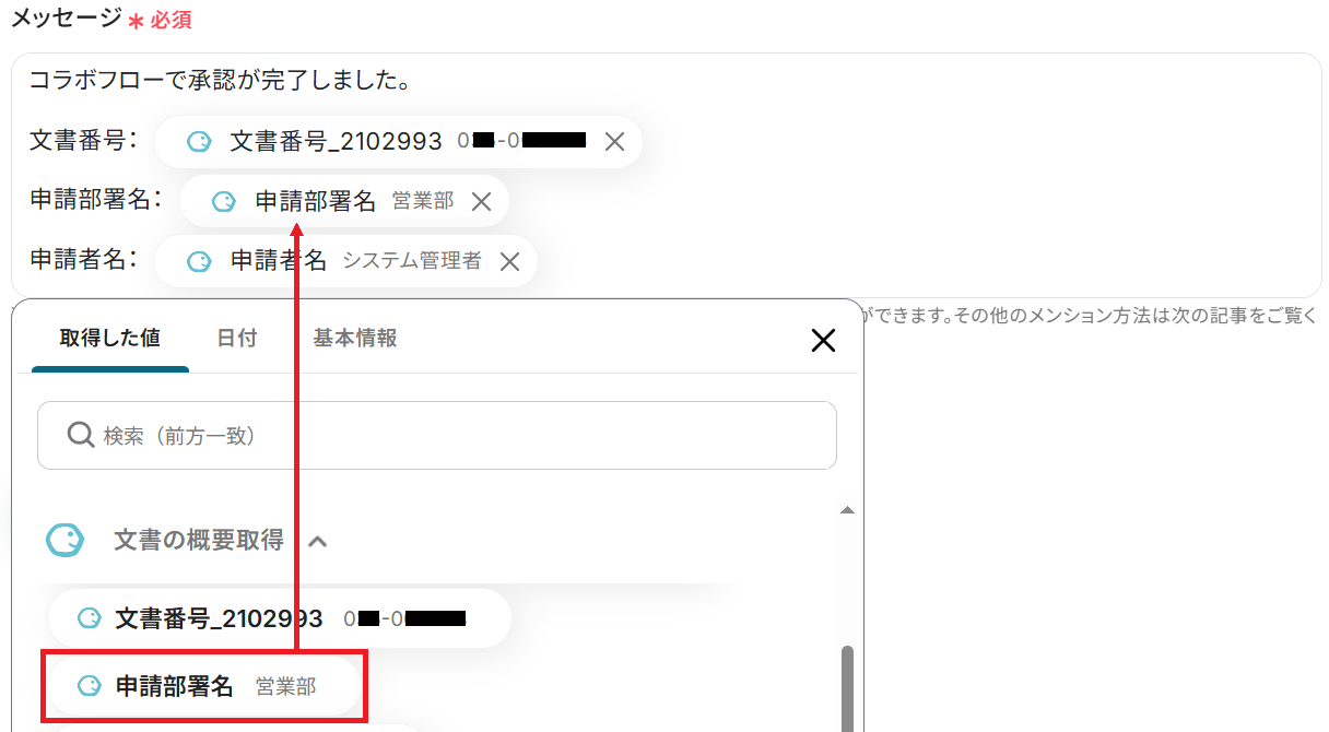 続けて、メッセージを入力しましょう。 コラボフローから取得した値などの変数や、固定の文章を組み合わせて自由にカスタマイズできます。 メンションも可能です。