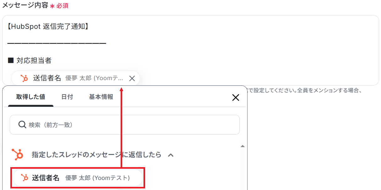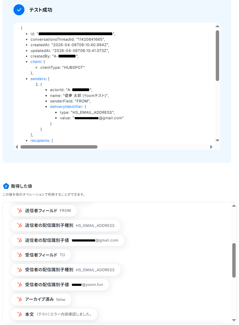 スレッドIDが分からない場合、HubSpotの「受信トレイのスレッド一覧を取得」アクションを用いることで確認できます。