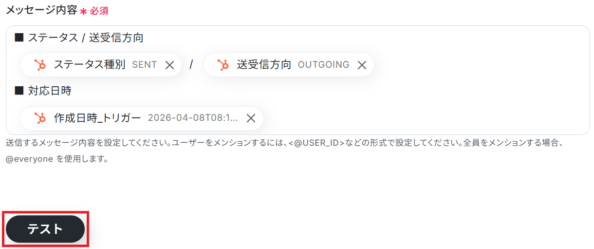 ※「テスト」をクリックすると設定したチャンネルへ実際に投稿されます。テストの際はテスト用のチャンネルに投稿したり、事前にメンバーに通知しておくなどがおすすめです。