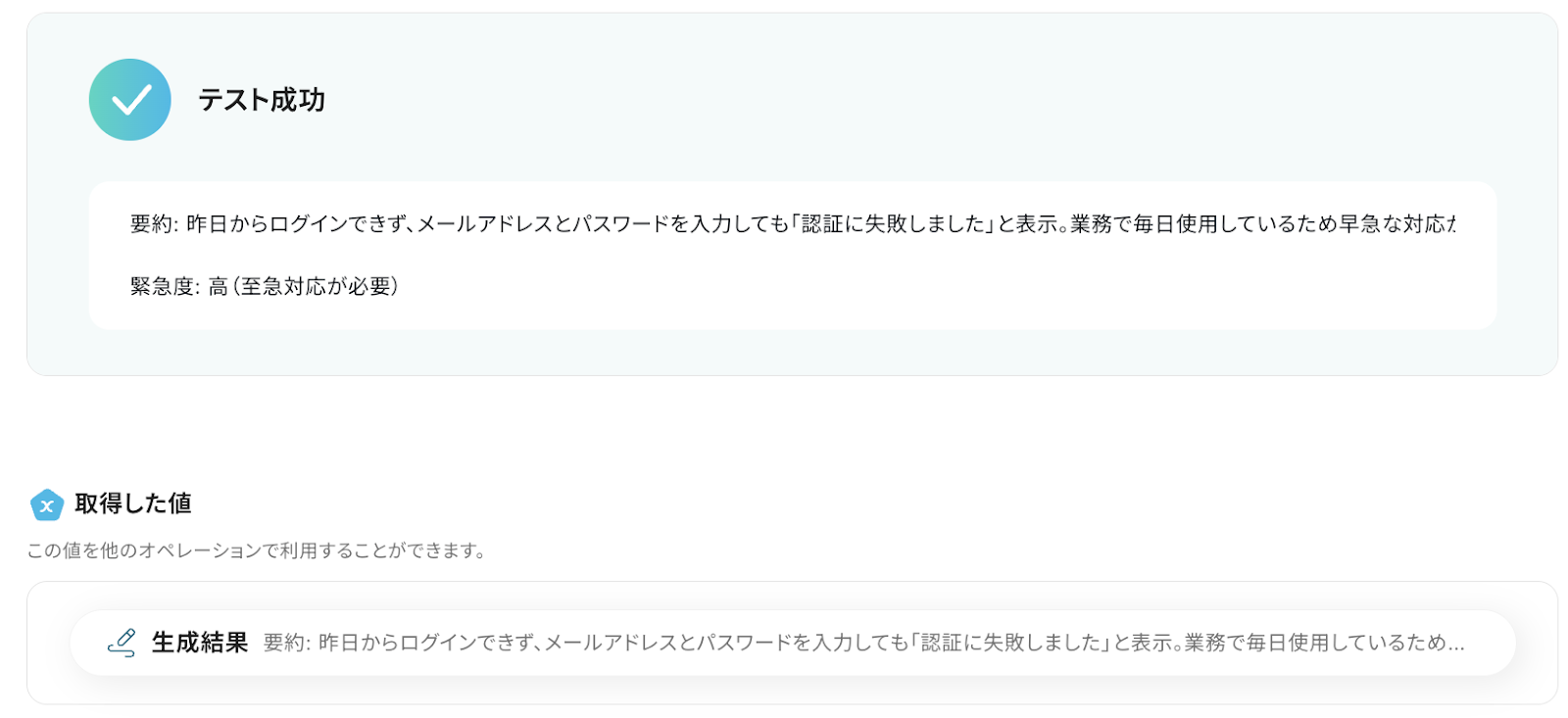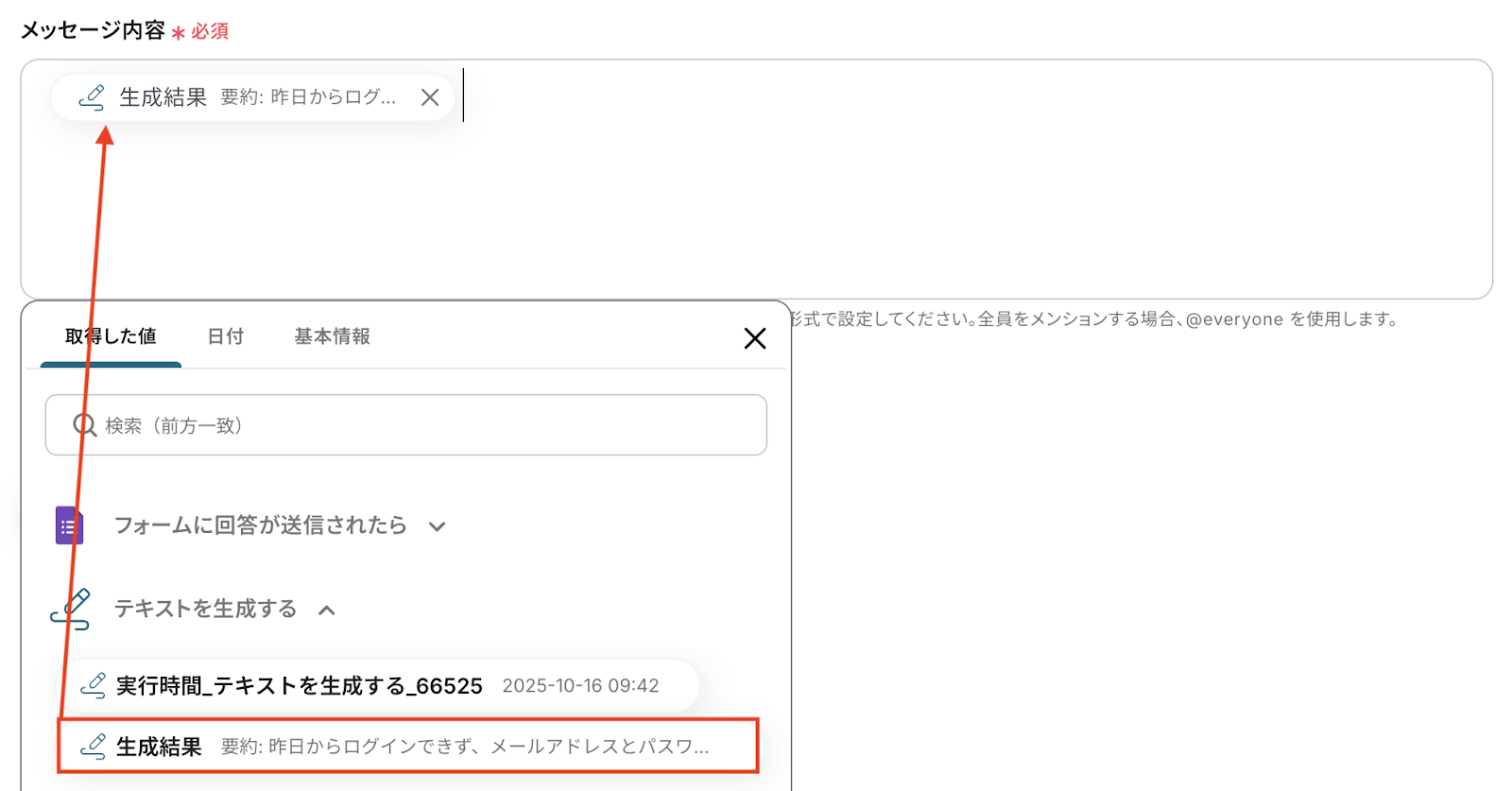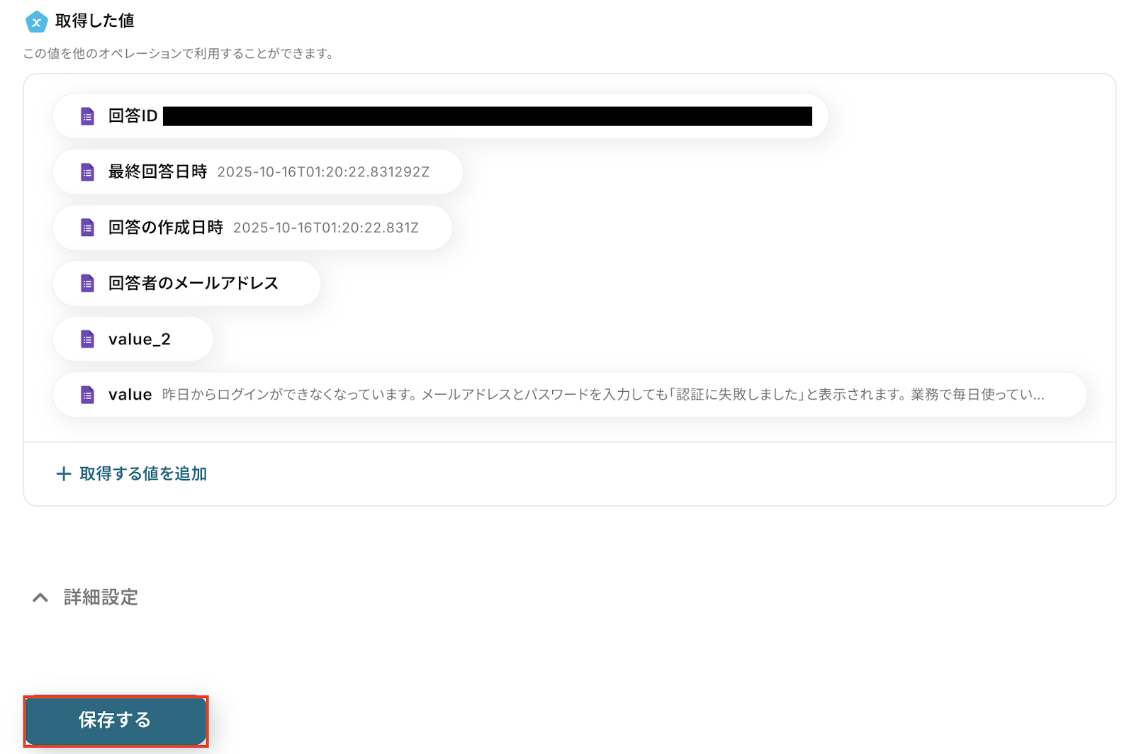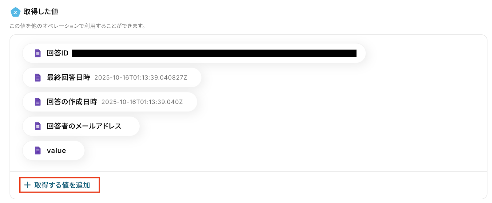 ここで追加した「取得した値(回答内容)」は、この後のステップでAI機能による要約処理に利用されます。
