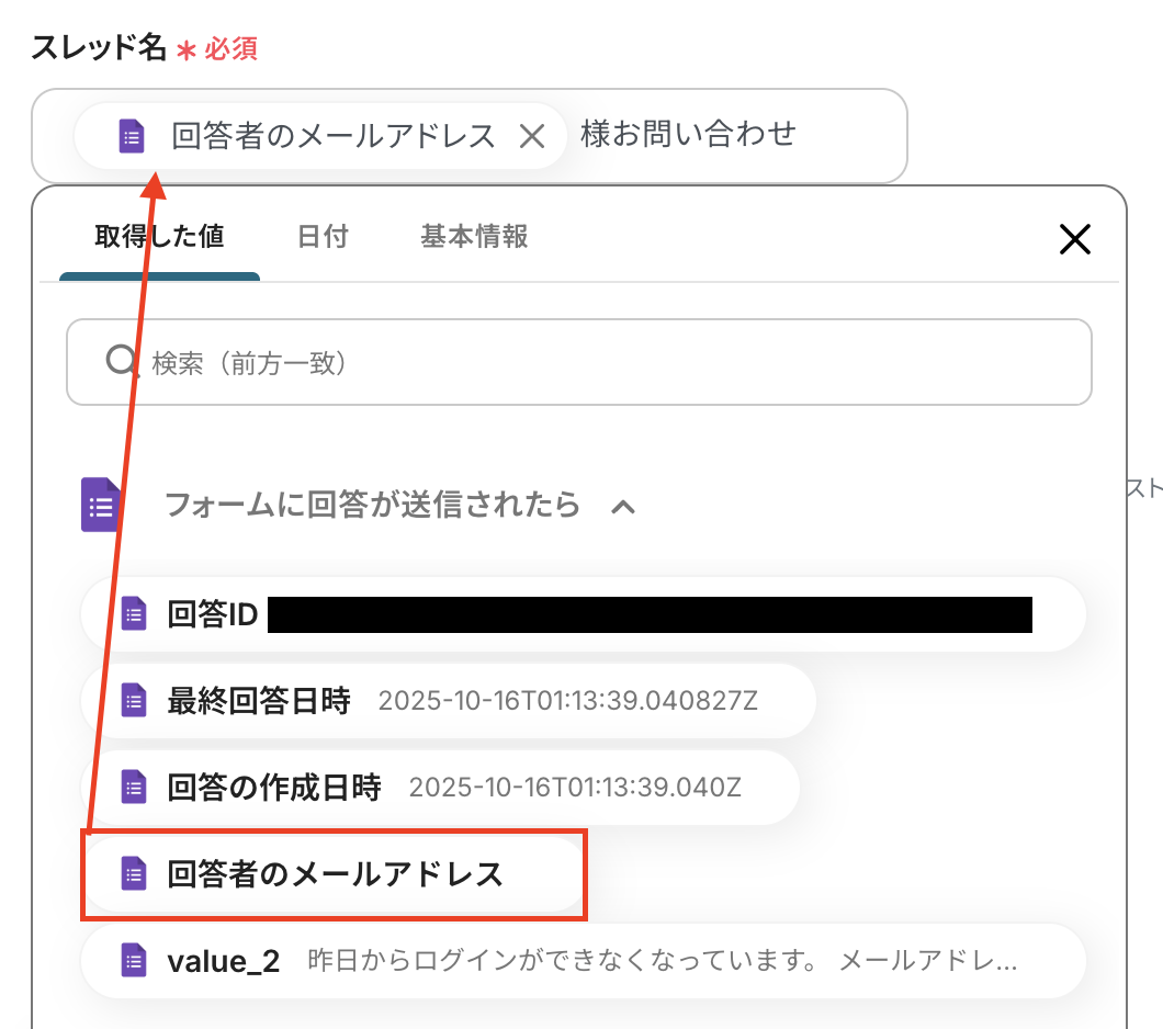 スレッド名には、たとえばGoogleフォームのトリガーで取得したメールアドレスや氏名などを動的に挿入し、テキスト(固定値)と組み合わせることで、「〇〇様お問い合わせ」など自動でタイトルを生成できます。(以下画像参照)