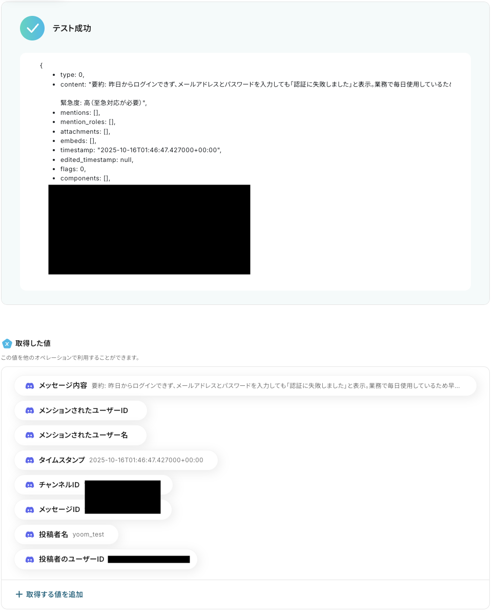 今回は、この後のステップで回答内容をAIで要約・生成し、Discordにメッセージとして送信する処理を行うため、取得した値にユーザーの回答内容を手動で追加しておく必要があります。