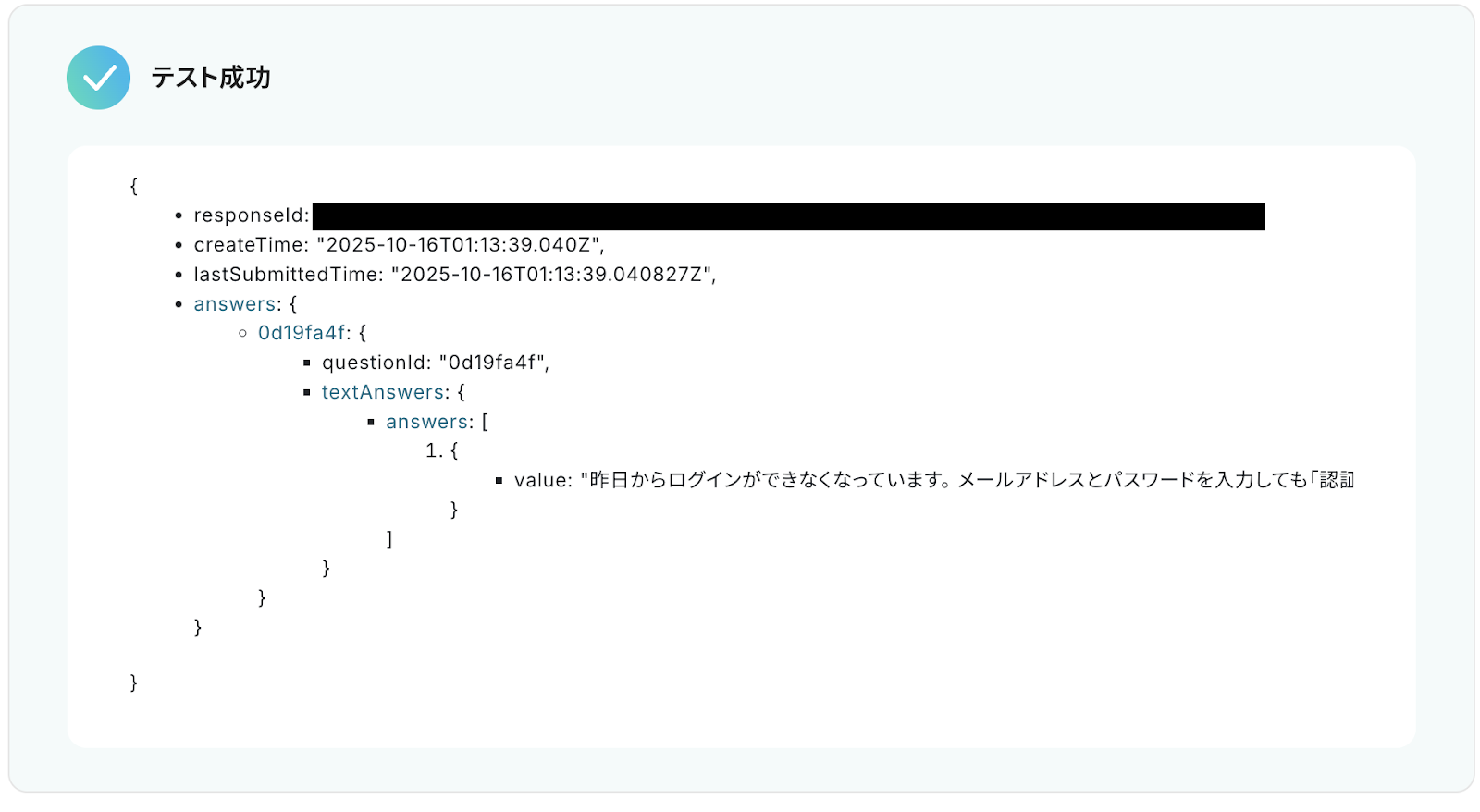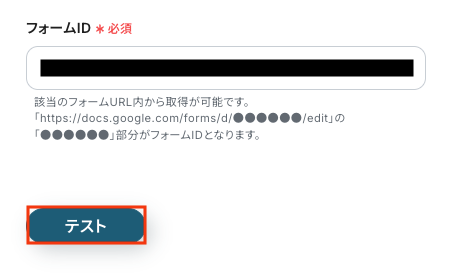 入力が完了したら「テスト」をクリックし、Googleフォームに送信した回答内容が正しく取得できるか確認してください。