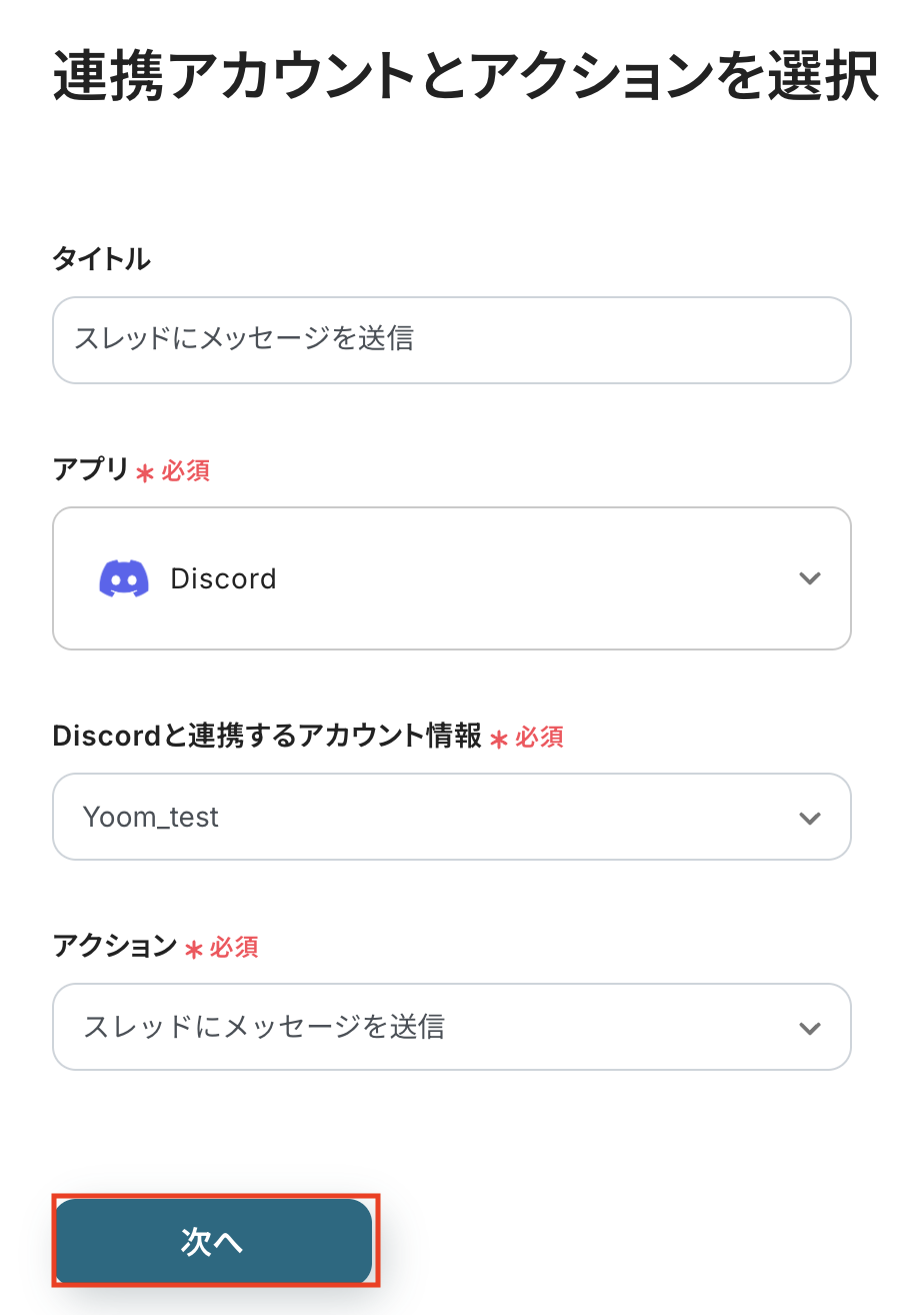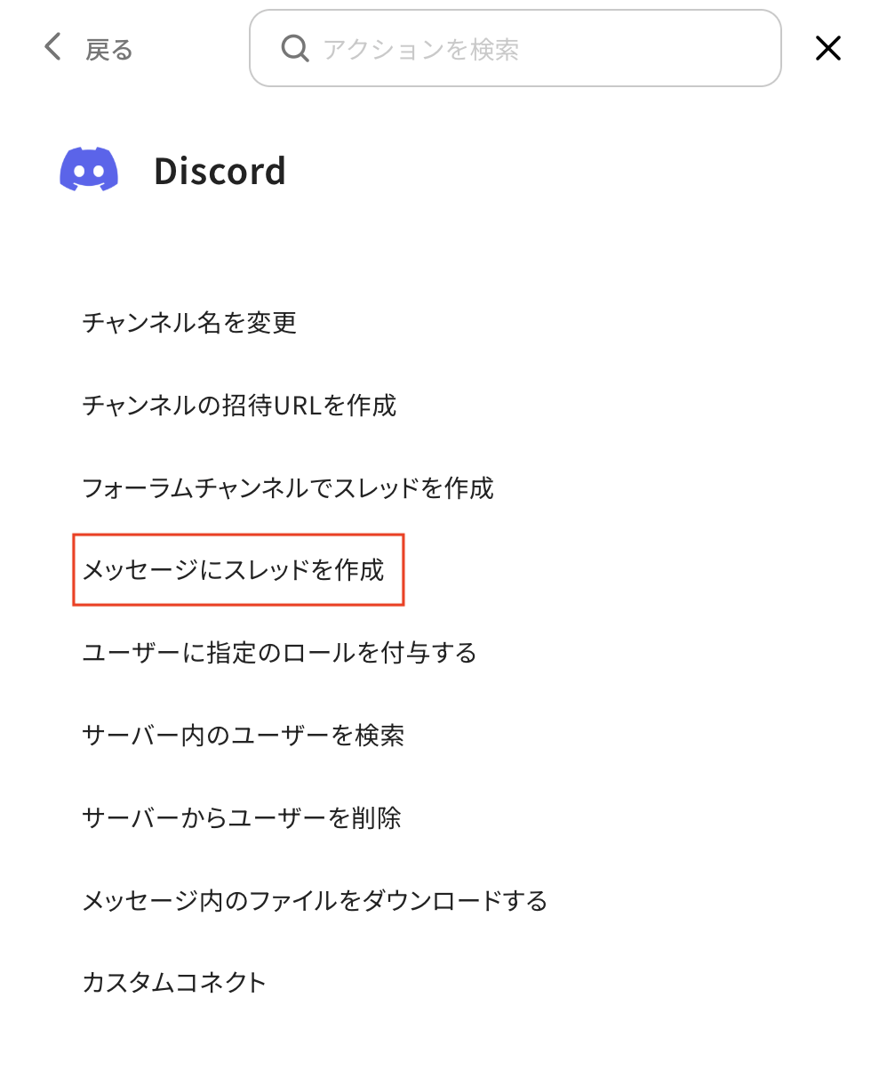 Discordの「メッセージにスレッドを作成」アクションを追加し、その後の設定を進めてください。