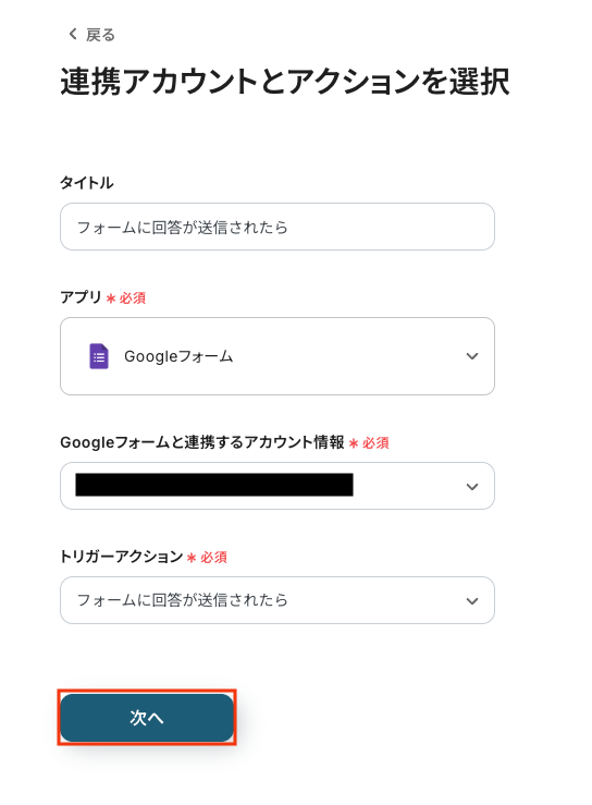 Googleフォームと連携するアカウント情報に問題がなければ、「次へ」をクリックします。