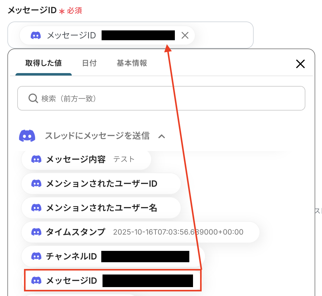 設定画面から「スレッドにメッセージを送信」アクションで取得したメッセージIDを指定します。