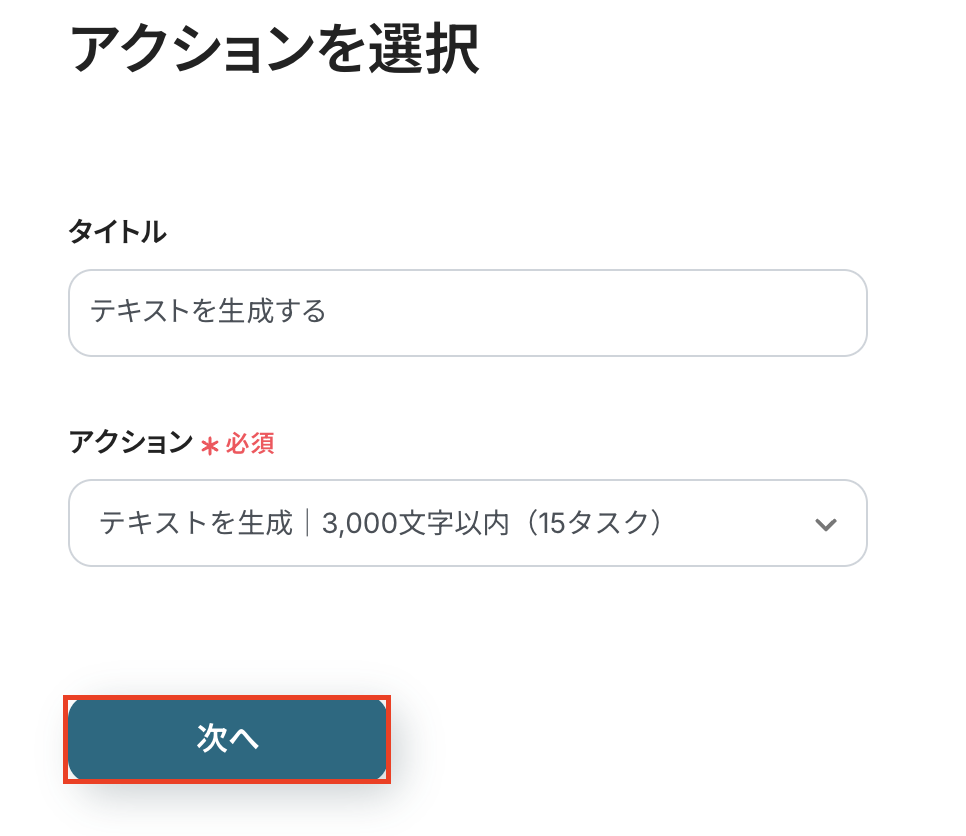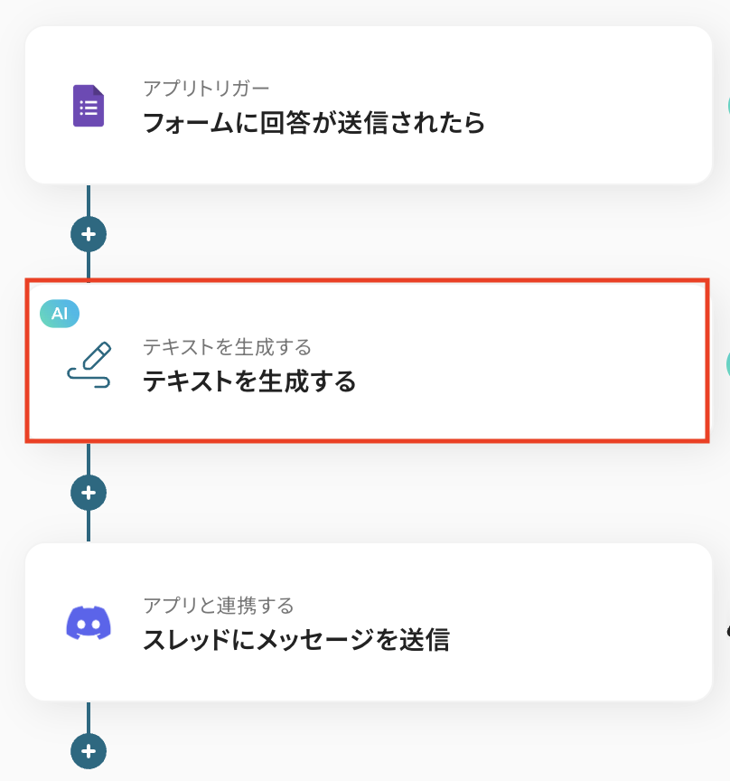 続いて、Googleフォームから取得した回答内容をもとに、AI機能でテキストを要約・生成する設定を行いましょう。