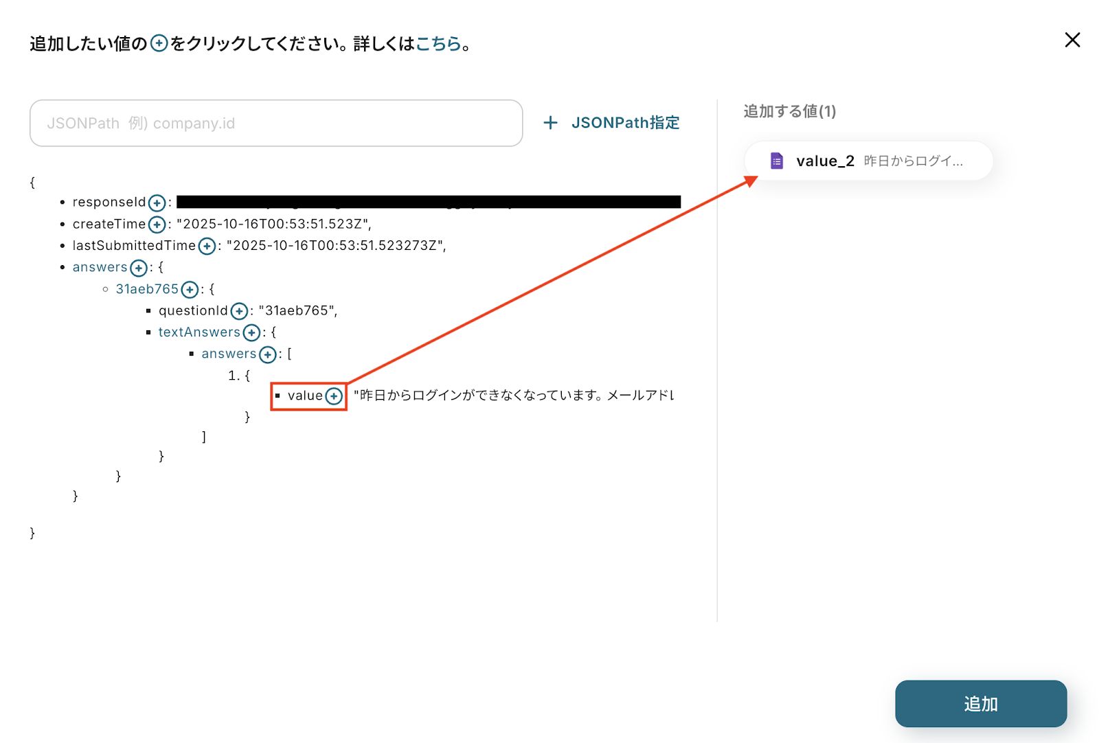 テスト結果内の取得したい値の横にある「+」アイコンをクリックすると、右側の「追加する値」欄に項目を追加できます。
