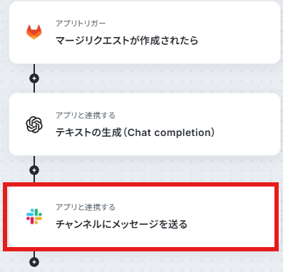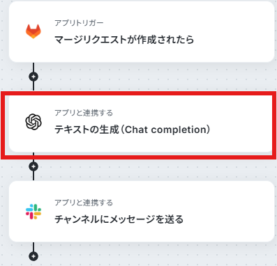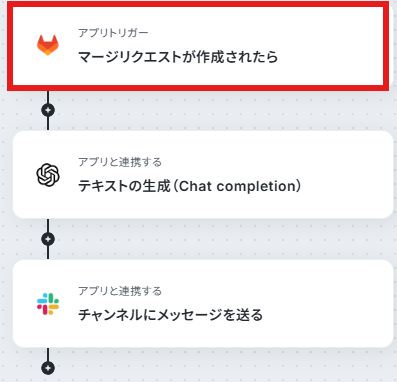 はじめに、GitLab、OpenAI、SlackをYoomと連携します 次に、トリガーでGitLabを選択し、「マージリクエストが作成されたら」というアクションを設定します 続いて、オペレーションでOpenAIの「テキストの生成(Chat completion)」アクションを設定し、取得した情報を要約します 最後に、オペレーションでSlackの「チャンネルにメッセージを送る」アクションを設定し、AIが生成した要約を指定のチャンネルに通知します ※「トリガー」:フロー起動のきっかけとなるアクション、「オペレーション」:トリガー起動後、フロー内で処理を行うアクション