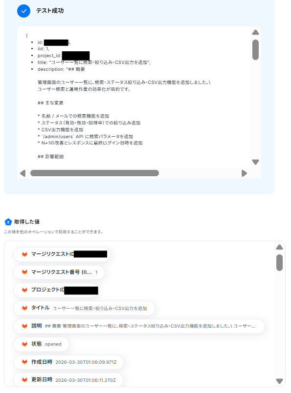 GitLabのトリガー設定では、自動化の対象としたいプロジェクトIDや、一度に取得するマージリクエストの件数を任意で設定できます。 OpenAIでテキストを生成するアクションでは、要約の形式などを指定するプロンプトを自由にカスタマイズでき、GitLabから取得した情報を変数として埋め込めます。 Slackへの通知アクションでは、メッセージを送るチャンネルを任意に設定可能です。また、通知本文も自由に編集でき、AIが生成した要約などの情報を変数として活用できます。 ■注意事項