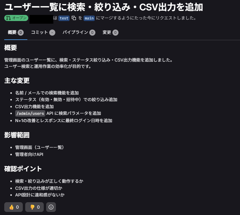今回は以下のようなマージリクエストをGitLabに作成しています。