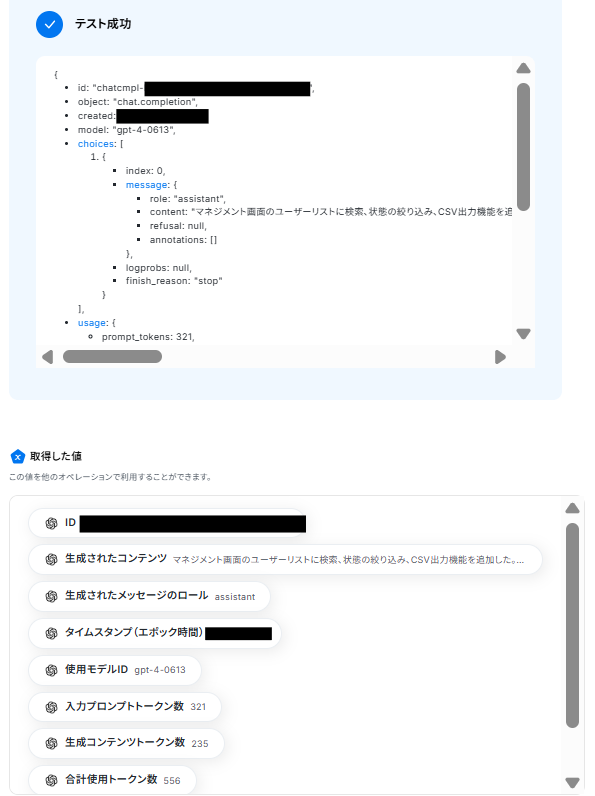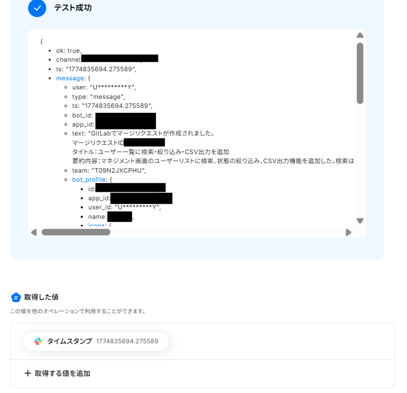 ここまで終わったらテストボタンをクリックしましょう。 テストが成功し取得した値が入ります。 ※取得した値 とは? トリガーやオペレーション設定時に、「テスト」を実行して取得した値のことを指します。 後続のオペレーション設定時の値として利用でき、フローボットを起動する度に変動した値となります。